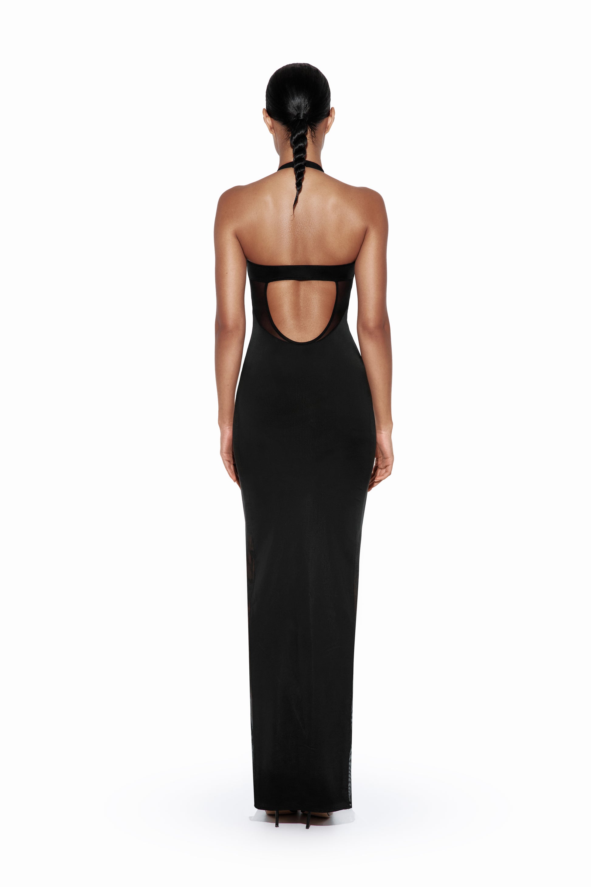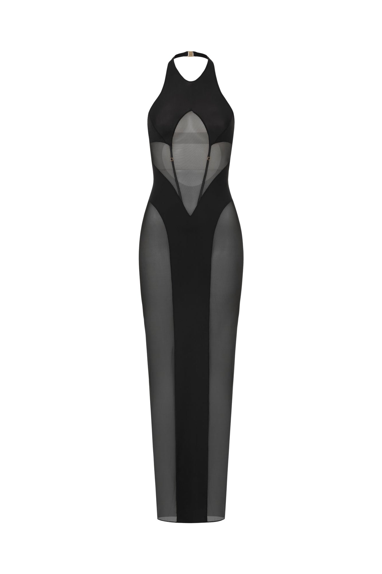 Халтер-горловина формує верхню частину силуету, а прозорі сітчасті вставки відкривають форму з точністю та стриманістю.