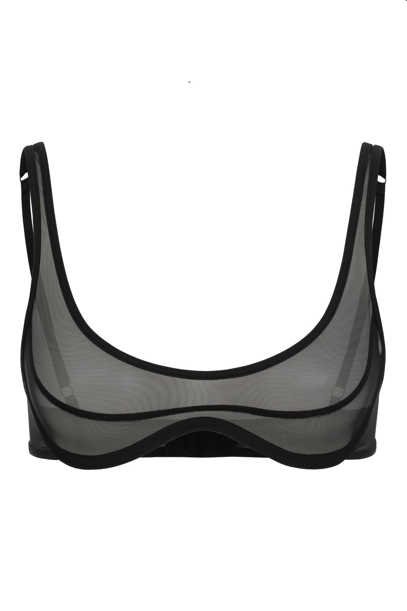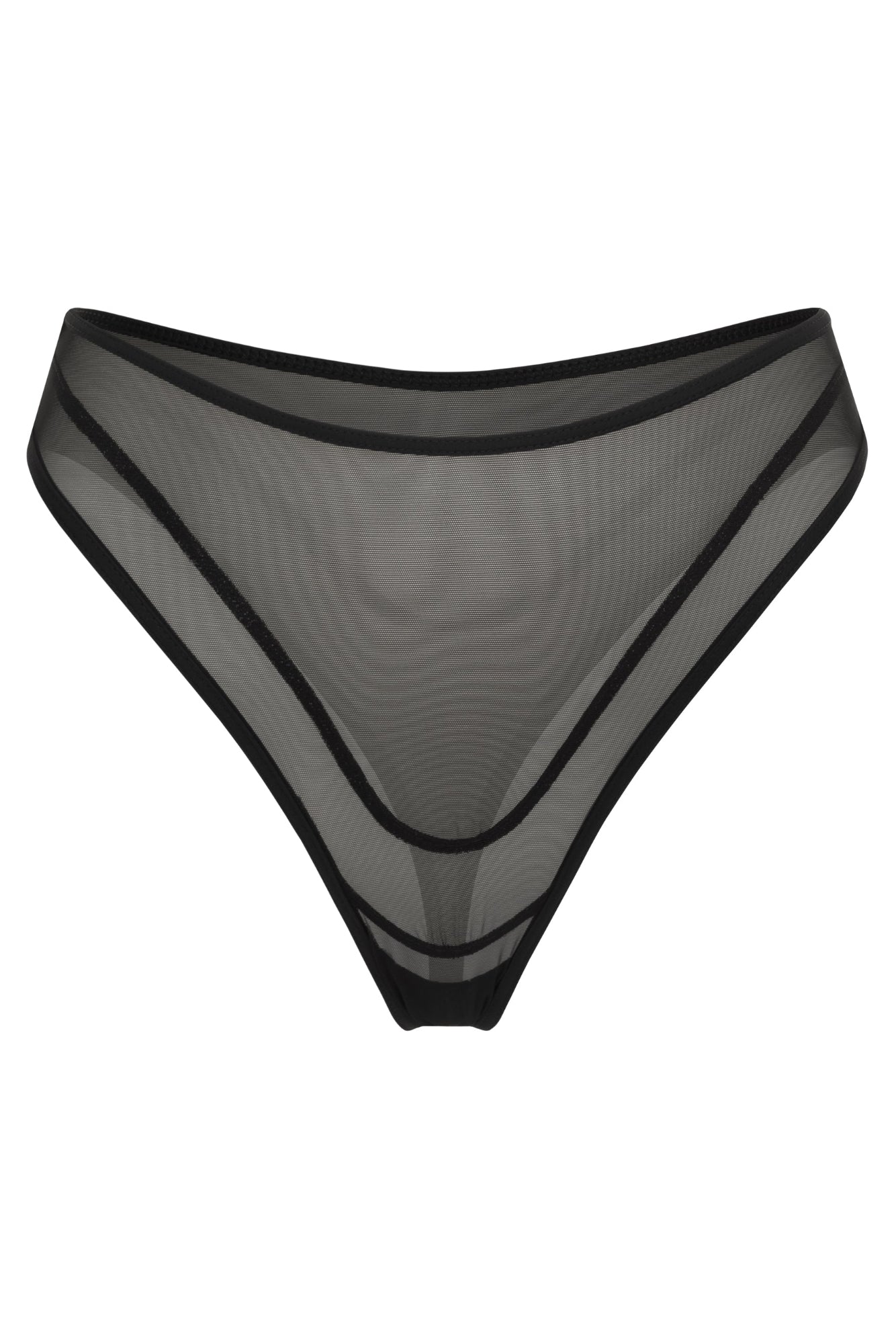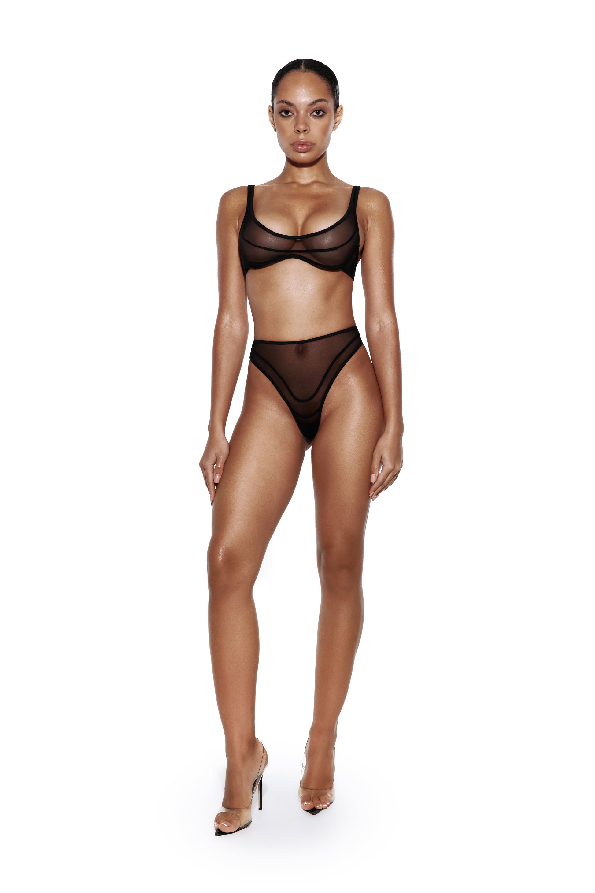 Сітчастий бра м’яко підкреслює груди, повторюючи природні лінії тіла, тоді як стрінги формують силует і візуально подовжують ноги.
